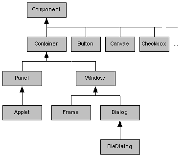 Das Abstract Windowing Toolkit von Java enthält verschiedene Fensterklassen, die über eine gemeinsame Vererbungshierarchie miteinander in Verbindung stehen (siehe Abbildung 27.1). Oberste Fensterklasse ist Component, daraus wurde Container abgeleitet. Container ist die Oberklasse der beiden Klassen Window und Panel. Während Window sich in die Unterklassen Frame und Dialog verzweigt, wird aus Panel die Klasse Applet abgeleitet. Unterhalb von Dialog gibt es noch den Standard-File-Dialog in der Klasse FileDialog.
