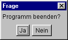 Das folgende Beispiel demonstriert die Anwendung der Klasse Dialog. Es zeigt einen Frame, aus dem per Buttonklick ein modaler Dialog aufgerufen werden kann. Der Dialog fragt den Anwender, ob die Anwendung beendet werden soll, und wartet, bis einer der Buttons »Ja« oder »Nein« gedrückt wurde. In diesem Fall wird ein boolescher Rückgabewert generiert, der nach dem Schließen des Dialogs an das Vaterfenster zurückgegeben wird. Falls der Rückgabewert true (entprechend dem Button »Ja«) ist, wird die Anwendung beendet, andernfalls läuft sie weiter: