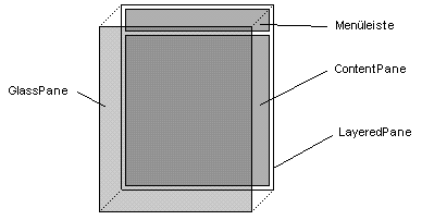 LayeredPane und GlassPane liegen "übereinander" und füllen das Fenster jeweils komplett aus. Die GlassPane ist normalerweise durchsichtig und wird meist nicht zur Grafikausgabe benutzt. Sie könnte dann verwendet werden, wenn Effekte erzielt werden sollen, die das Fenster als Ganzes betreffen (und nicht seine einzelnen Dialogelemente). Eine (beispielsweise von JInternalFrame genutzte) Funktion besteht darin, Mausereignisse abzufangen, bevor sie an andere Komponenten weitergegeben werden.