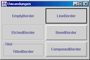 JComponent bietet die Möglichkeit, ihren Instanzen eine Umrandung zu geben. Dazu gibt es die Methode setBorder, mit der der Komponente ein Objekt des Typs Border zugewiesen werden kann: