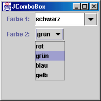 Eine JComboBox ist das Swing-Pendant zur AWT-Klasse Choice. Es stellt eine Kombination aus Textfeld und Liste dar. Die Liste ist normalerweise unsichtbar und wird vom Anwender nur dann geöffnet, wenn er einen Wert daraus auswählen will. Sie erlaubt grundsätzlich nur einfache Selektion. Die wichtigsten Konstruktoren von JComboBox sind: