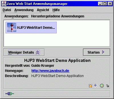 Durch Drücken des »Starten«-Buttons wird unsere Anwendung gestartet. Die internen Abläufe unterscheiden sich dabei nicht von denen beim Starten über den Link im Browser. Zunächst wird stets die jnlp-Datei geladen und alle darin beschriebenen Ressourcen überprüft bzw. aktualisiert. Sind alle Dateien verfügbar, wird die Anwendung gestartet. Taucht ein Problem auf, bricht WebStart den Startvorgang ab und gibt eine Fehlermeldung aus. Wir wollen hier nicht weiter auf Details eingehen; der WebStart-Applikationsmanager ist einfach aufgebaut, und seine Funktionen sind weitgehend selbsterklärend.