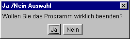 Das folgende Beispiel demonstriert die Anwendung der Klasse Dialog. Es zeigt einen Frame, aus dem per Buttonklick ein modaler Dialog aufgerufen werden kann. Der Dialog fragt den Anwender, ob die Anwendung beendet werden soll, und wartet, bis einer der Buttons »Ja« oder »Nein« gedrückt wurde. In diesem Fall wird ein boolescher Rückgabewert generiert, der nach dem Schließen des Dialogs an das Vaterfenster zurückgegeben wird. Falls der Rückgabewert true (entprechend dem Button »Ja«) ist, wird die Anwendung beendet, andernfalls läuft sie weiter: