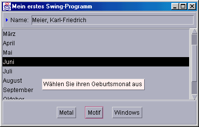 Durch Drücken der Buttons kann das Look-and-Feel umgeschaltet werden. Abbildung 35.2 zeigt das Programm mit aktiviertem Motif-, Abbildung 35.3 mit aktiviertem Windows-Look-and-Feel.